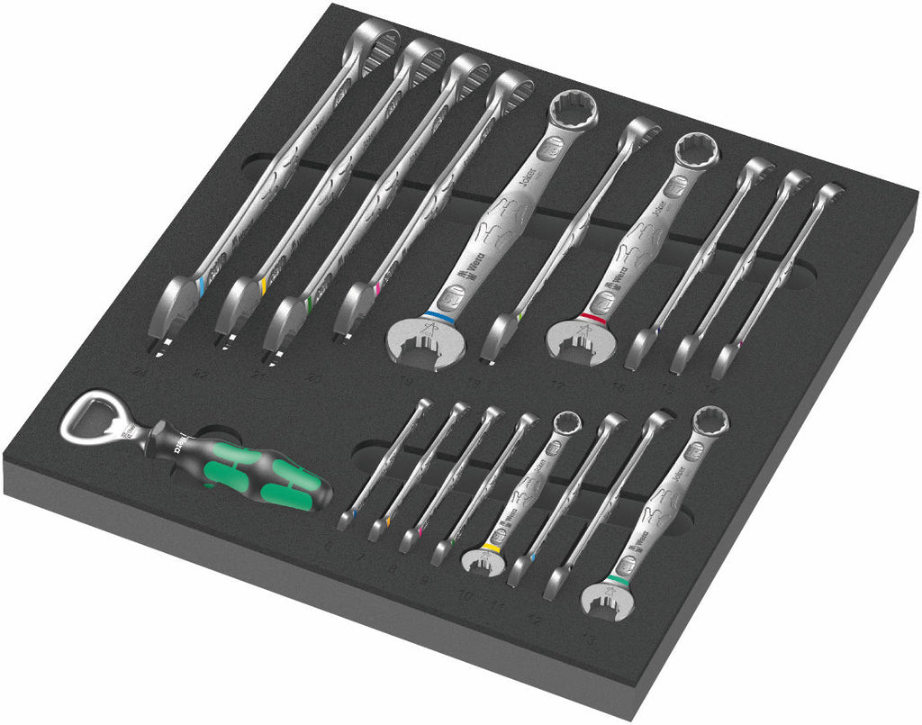 Setet innehåller 18 Wera 6003 Joker ring-U-nycklar och 1 Wera Kraftform-flasköppnare. Ring-U-nycklarna är särskilt lämpade för arbete i trånga utrymmen och har en specialutformad käftgeometri som ger fler ansättningsmöjligheter. Den minimala returvinkeln på 15° gör skruvning snabb och effektiv.