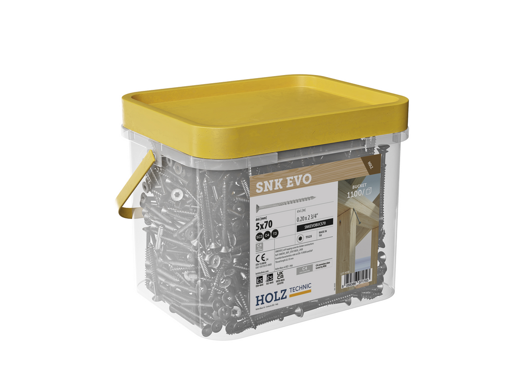 SNK EVO Ă€r en kraftfull konstruktionsskruv för trĂ€, framtagen för krĂ€vande montage bĂ„de inom- och utomhus. Skruven har samma mekaniska prestanda som klassiska SNK, men med ett uppgraderat EVO-ytlager som ger dokumenterat skydd i korrosivitetsklass C4 – Ă€ven i kustnĂ€ra och industriella miljöer.