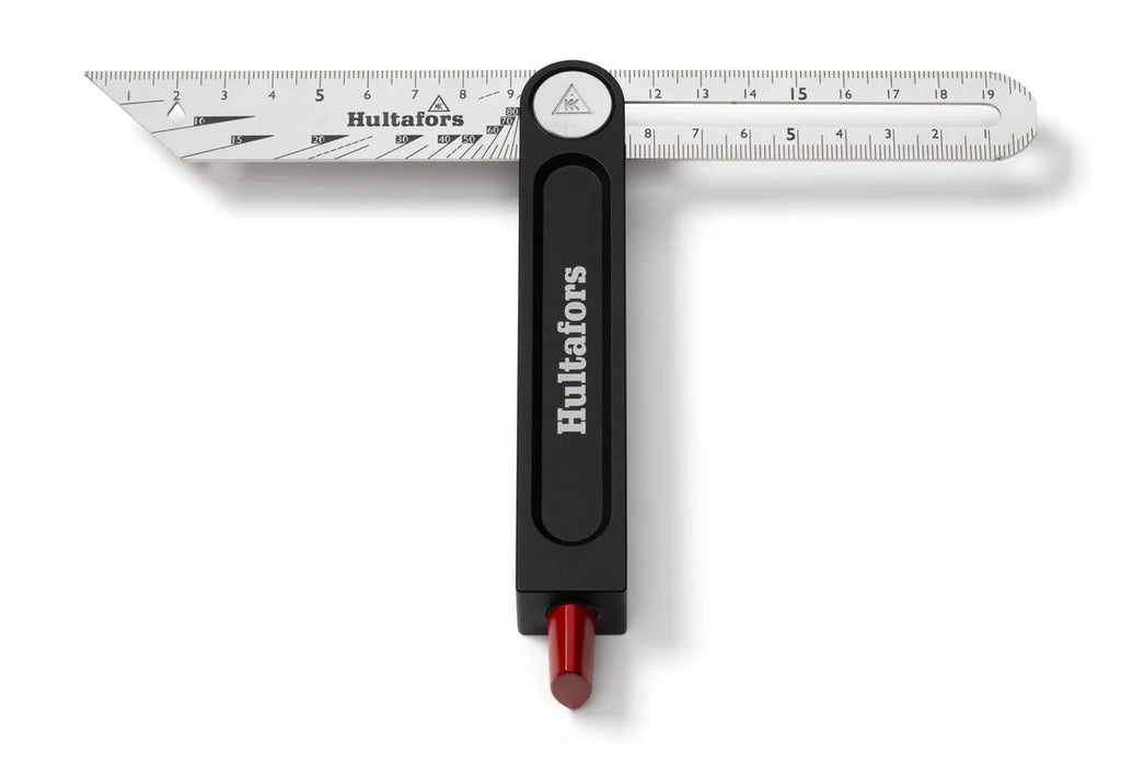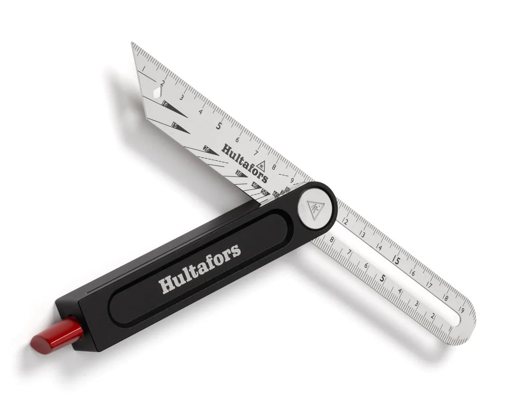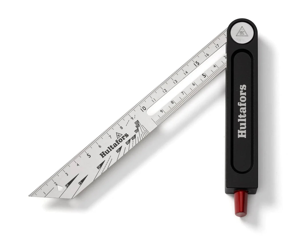 Smygvinkel med flera smarta funktioner. Det 20cm långa bladet har en slitstark, laseretsad millimeterskala samt angivna vinklar (0-90°) på bägge sidor. I den spetsiga änden av bladet finns en märkskåra och den andra änden har en tillplattad kant, båda för att enklare kunna överföra längdmått med kniv eller penna. Den platta kanten har dessutom en egen längdskala för tex djuphålsmätning.