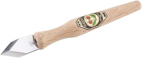 Bladet är prismatiskt och fungerar lika bra i höger som vänster hand. Det är gjort av kolstål som håller skärpan länge. Skaftet i röd bok ger bra grepp och kontroll vid precisionsjobb, även under längre pass.
