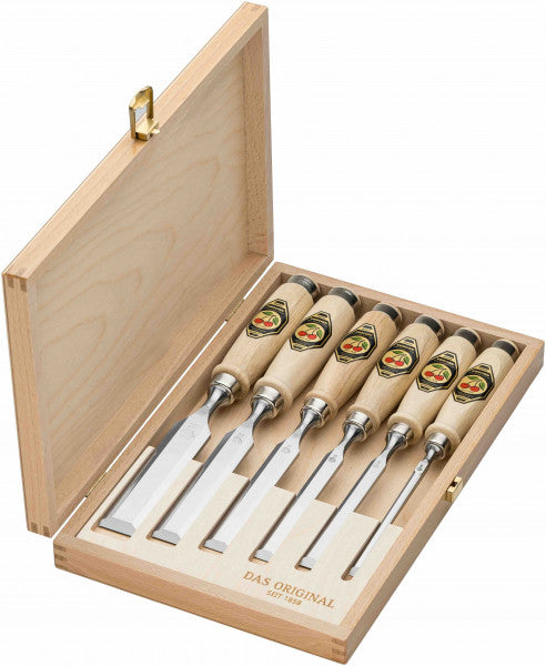 Detta högkvalitativa set innehåller stämjärn i bredderna 6, 10, 12, 16, 20 och 26 mm – perfekt för finsnickeri, tapphål och detaljarbeten.