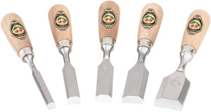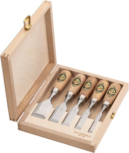 Stämjärnset i 5 delar med korta stämjärn. Tillverkat enligt DIN 5139 med sidofas och bokhandtag. Levereras i en robust trälåda. Storlekar: 10, 16, 20, 26 och 35 mm.