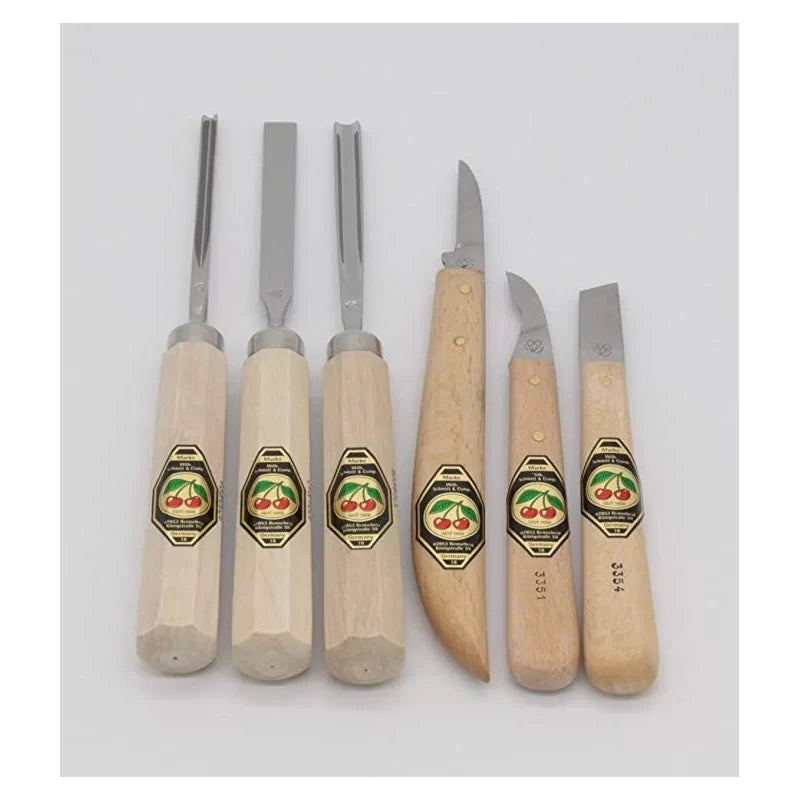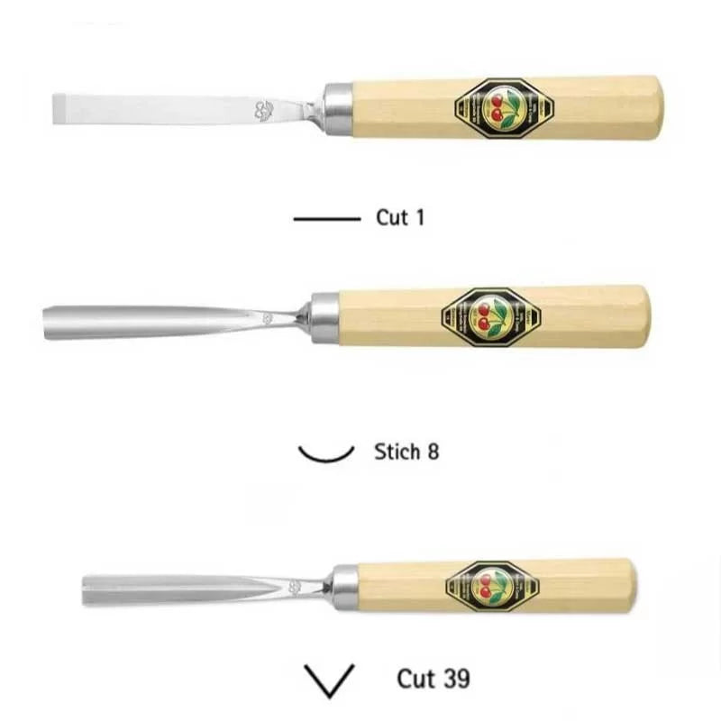 Setet är anpassat för mjukt till medelhårt trä och passar för små till medelstora skulpturer, snidesdekorationer och inlägg. Tillverkade i Tyskland.