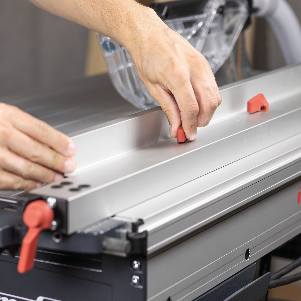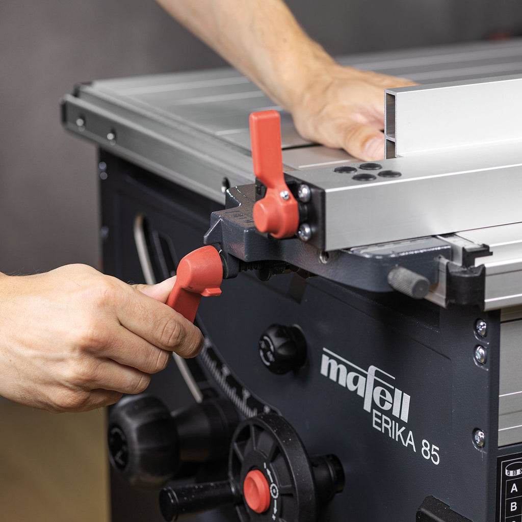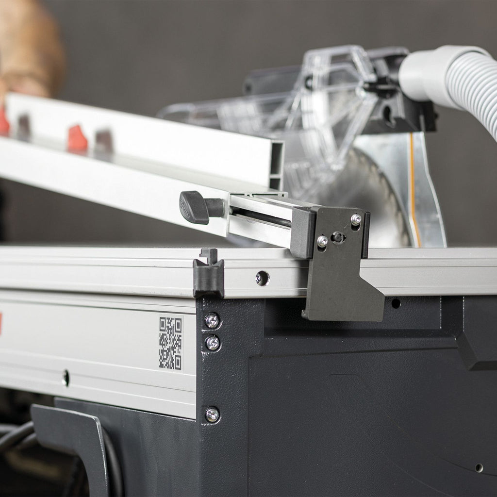 Detta bordanhåll fästs snabbt och enkelt på den bakre bordsprofilen, vilket gör att det kan monteras på nolltid. Med hjälp av två smidiga spakklämmor flyttas och justeras stoppskenan utan ansträngning.