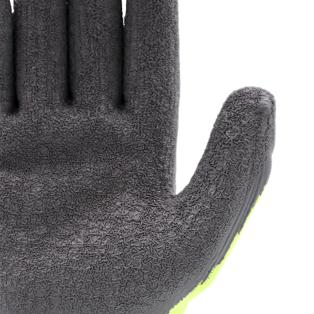 Handskens ovansida i stickad polyester låter handen andas, vilket ökar komforten även vid längre arbetspass. Den gula signalfärgen ökar synligheten och säkerheten i mörka arbetsmiljöer.